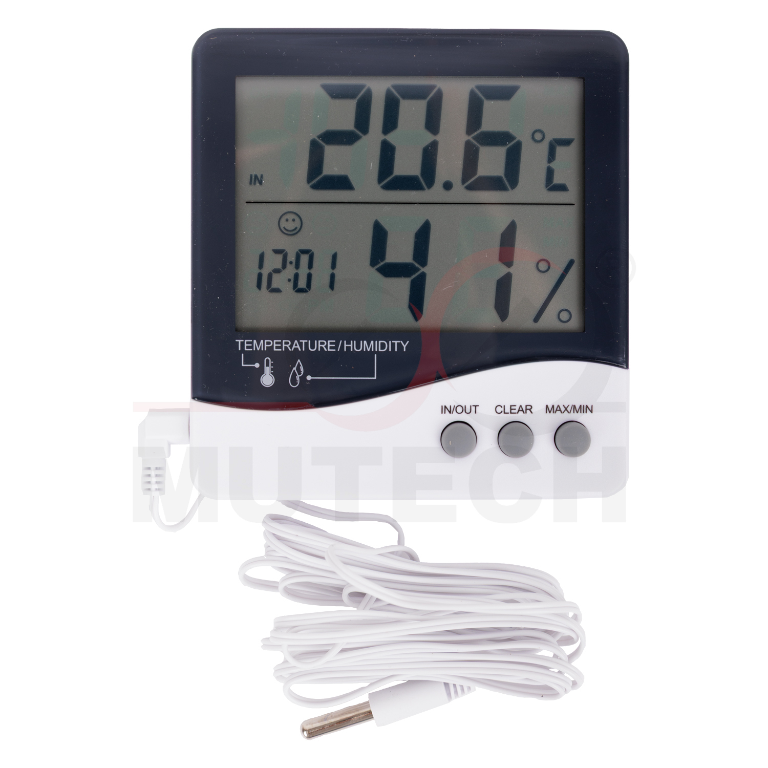 - Pomiar temperatury: Urządzenie wyposażone jest w dwa czujniki temperatury – wewnętrzny oraz zewnętrzny na 3-metrowym przewodzie, umożliwiające pomiar zarówno wewnątrz, jak i na zewnątrz pomieszczeń.