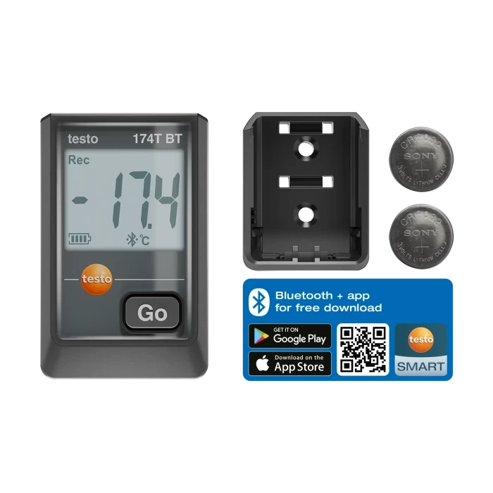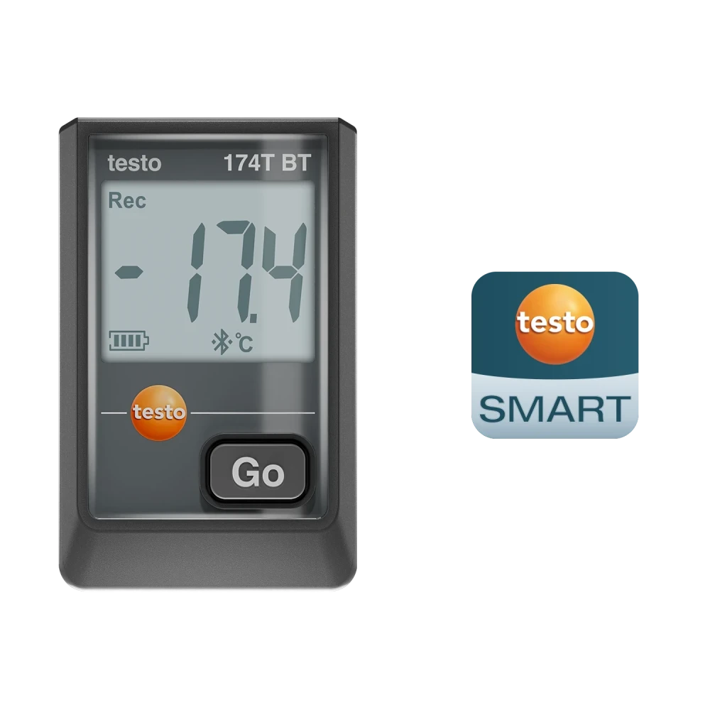 Testo 174 T BT to kompaktowy mini rejestrator temperatury przeznaczony do ciągłego monitorowania warunków w pomieszczeniach, magazynach, chłodniach oraz systemach HVAC/R. Urządzenie mierzy temperaturę w zakresie -30°C do +70°C i umożliwia bezprzewodowy odczyt danych przez Bluetooth® z odległości do 30 metrów za pomocą bezpłatnej aplikacji Testo Smart App.